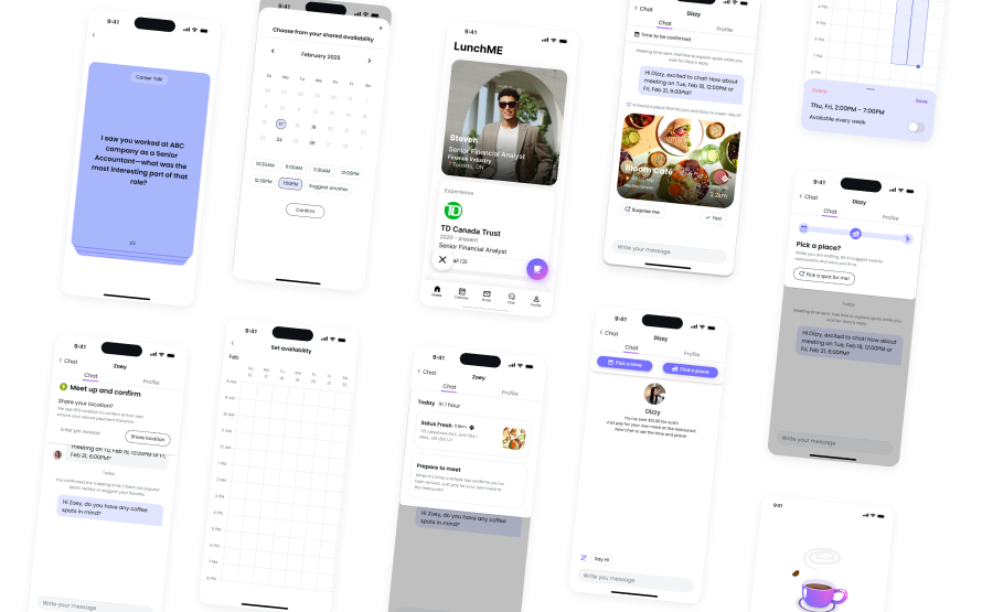 LunchME is a social coffee chat platform designed to help users grow their professional network over shared meals. A key challenge emerged after invitations were accepted: many users stalled in chat interface without moving forward to schedule a meetup. This redesign introduced a lightweight, AI-assisted scheduling flow directly into the chat, reducing friction, speeding up decision-making, and strengthening online-to-offline conversion.